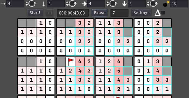 4D Minesweeper mang tới cơ chế chơi nổi tiếng của Minesweeper lên không gian 4 chiều. Tại đây, mỗi ô vuông có tối đa 80 “hàng xóm”, cung cấp cho bạn rất nhiều thông tin. Điều này đồng nghĩa khả năng bạn phải đoán tiến trình ít hơn và mối quan hệ giữa các hình vuông cũng trở nên phức tạp hơn. Hơn 80 cấp độ trong 4D Minesweeper đang chờ bạn chinh phục. Bạn có tự tin hoàn thành hết mọi thử thách mà game dò mìn 4D này đưa ra? Hãy thử và tự tìm câu trả lời cho mình nhé!