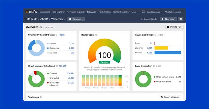 Là một công cụ theo dõi thứ hạng, Ahrefs có nhiều tính năng giống như Semrush . Bạn có thể theo dõi các trang web hoặc tên miền cụ thể để xem thứ hạng của chúng theo từ khóa theo thời gian, thực hiện kiểm tra trang web và khám phá dữ liệu xếp hạng lịch sử bằng biểu đồ có thể tùy chỉnh. Trang web này cũng có một số tính năng bonus hấp dẫn như Web Explorer – cho bạn thấy số liệu thống kê xếp hạng cho các trang trên web cho các từ khóa nhất định.