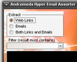 Với Andromeda Hyper Email Assorter, bạn sẽ có thể tự động nhận được danh sách email, đường link trang web, hoặc bất cứ loại thông tin nào và lưu trữ chúng để sử dụng về sau. Phần mềm này có thể quét và trích xuất dữ liệu được lưu trữ trong Windows clipboard, file riêng lẻ hoặc trong văn bản, HTM, XML và các file được hỗ trợ khác trong ổ cứng của bạn.