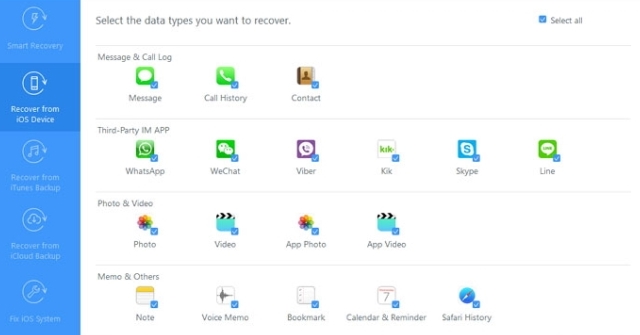 Người dùng có thể kết nối thiết bị iOS trên máy tính, tiến hành quét để dò dữ liệu bị mất. Trước khi làm việc này, người dùng có thể mô tả file đã mất bằng cách chọn tiêu chí phù hợp từ danh sách. Dựa trên câu trả lời, phần mềm sẽ cho ra kết quả tốt nhất.
