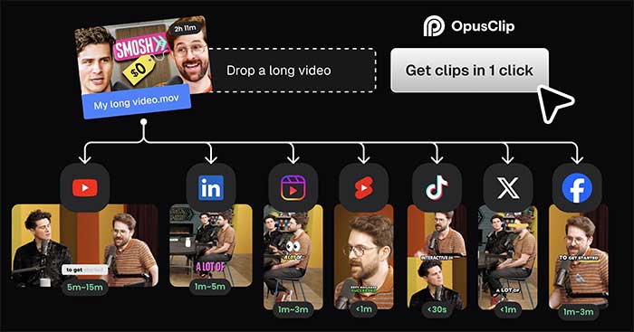 Opus Clip sử dụng trí tuệ nhân tạo AI để phân tích và xác định những khoảnh khắc quan trọng trong video dài, sau đó tự động đóng khung lại và chỉnh sửa chúng thành nội dung ngắn hơn, có thể chia sẻ lên mạng xã hội . Về cơ bản, nền tảng này sẽ biến video dài thành nội dung dạng ngắn dễ lan truyền và xuất bản trên phương tiện truyền thông xã hội.