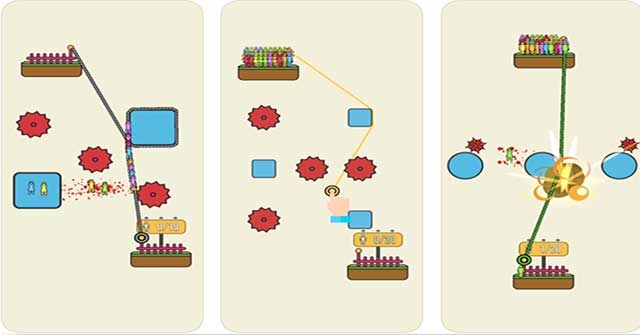 Mỗi màn chơi, bạn sẽ đối mặt với các thử thách khác nhau, độ khó tăng dần. Càng về sau, các chướng ngại càng nhiều hơn, được bố trí ở vị trí hiểm hóc, thậm chí chúng còn di chuyển. Chính vì thế, người chơi cần phải động não để tìm cách luồn dây thừng đi theo con đường an toàn nhất.