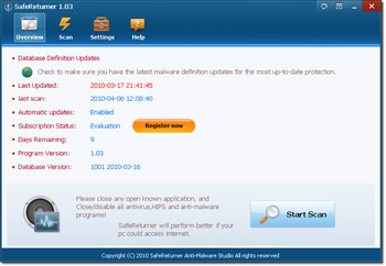 Safe Returner Plus 1.28 là công cụ chống phần mềm độc hại mạnh mẽ mà có thể gỡ bỏ trojan, worm, adware, spyware – khi phần mềm diệt virus chuẩn hoặc không phát hiện hoặc gỡ bỏ chúng không hiệu quả. Safe Returner có thể gỡ bỏ phần mềm độc hại tương đối nhanh chóng, nó hoạt động ở tốc độ cao với việc quét toàn bộ mất ít hơn 5 phút ngay cả với các chương trình sử dụng nhiều tài nguyên khác đang chạy. Safe Returner có một công cụ phát hiện phần mềm độc hại heuristic tự phát triển hiển thị mức độ nghiêm trọng của mối de dọa spyware.