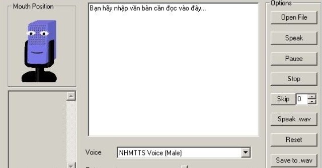 - Nhấn Speak : đọc, Pause : tạm ngừng, Stop : ngừng đọc, Speak .wav: đọc file wav, Reset: mặc định, Save to .wav: xuất ra file .wav, Voice Config: mở NHMTTS Voice Configuration, About: thông tin chương trình.
